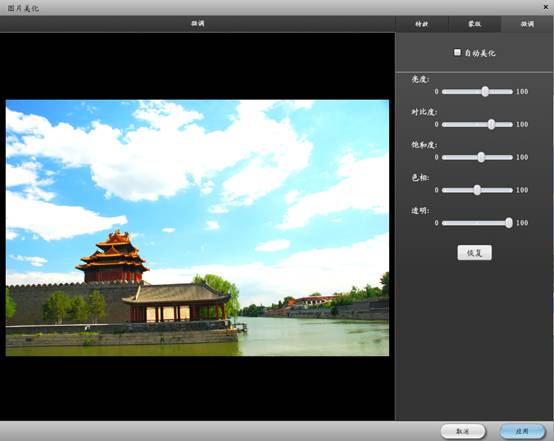 可对图片进行基于图片框的宽适应,高适应,上移,下移,可对图片进行旋转操作。对图片进行美化、阴影、描边、透明度、特效等操作,
